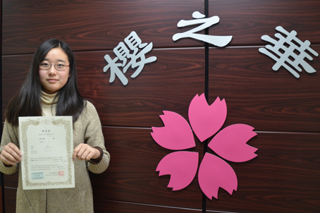 丁宁同学在我校报读J-Test 0-C套餐课程,通过努力学习,顺利考取J-TEST F等级证书,目前在我校继续学习中级课程,2017年4月份赴日本留学.
