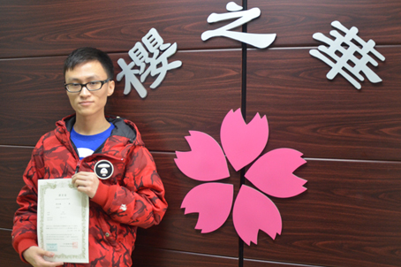 梁帅同学在我校报读中级课程和N2辅导课程,通过努力学习,顺利考取J-TEST E等级证书,目前在我校继续学习中级课程,并将于12月份参加N2考试,2017年4月份赴日本留学.