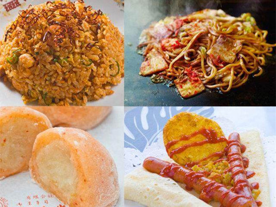 除了「死神炒饭」(左上)以外,备受喜爱的还有「鶴橋風月」的激辣炒面(右上),「御菓子処 栄久堂」的激辣大福(下「クレープのお店 オンリー 東向日駅前店(右下)的sudden death热狗。