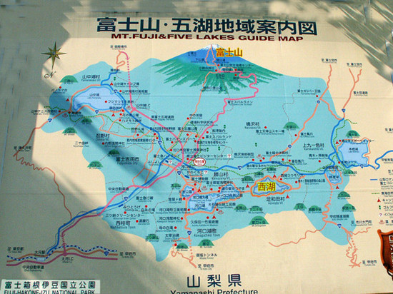 如果没有富士山北麓的富士五湖,富士山就会显得突兀孤立不丰满。富士五湖从东向西依次为山中湖、河口湖、西湖、精进湖和本栖湖。其中,山中湖最大,面积为6.75平方公里。湖畔有许多运动设施,可以打网球、滑水、垂钓、露营和划船等。湖东南的忍野村,有涌池、镜池等8个池塘统称“忍野八海”,它们都与山中湖相通。富士五湖中,河口湖是最早开发的,因此交通十分便利,已成为五湖观光的中心。此外,河口湖上还横跨一座长达1260米的大桥。