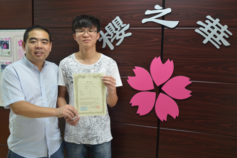 刘思奇同学于2015年3月份来到樱之华,刘同学平日上课表现非常积极,认真听讲积极发言,配合老师很好的带动了课堂气氛,在同学中人气也非常高.由于自身喜欢动漫,对日语非常感兴趣,学习方面也非常的认真努力.经过了初级日语以及J-Test强化课程的学习,参加了J-Test 121回的考试,并不负众望取得了476分的好成绩,名列121回J-Test考试总成绩第二名,为同学以及樱之华的后来学员们做出了非常好的榜样.樱之华的全体教师在为如此优秀的学员能来到樱之华学习感到高兴之余,也希望刘同学在自己今后的人生道路上能够取得更好的成绩!